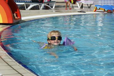 Barnen var i vattnet mellan kl. 9 och 17 varje dag, med paus för lunch. Att ha bra barnpoolar visade sig vara bättre för vattenvanan än en simskolekurs (dock liiite dyrare).